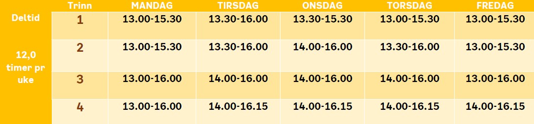 - 12 timer pr uke etter skoletid hver dag, etter oppsatt tabell nederst på siden.